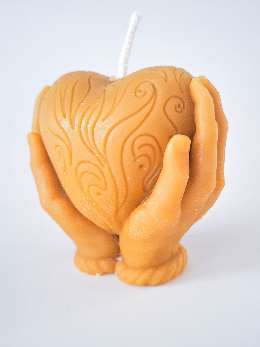 Paket Objem vsebuje en kozarec 450g lipovega medu SMGO ter veliko svečo srce v dlaneh.