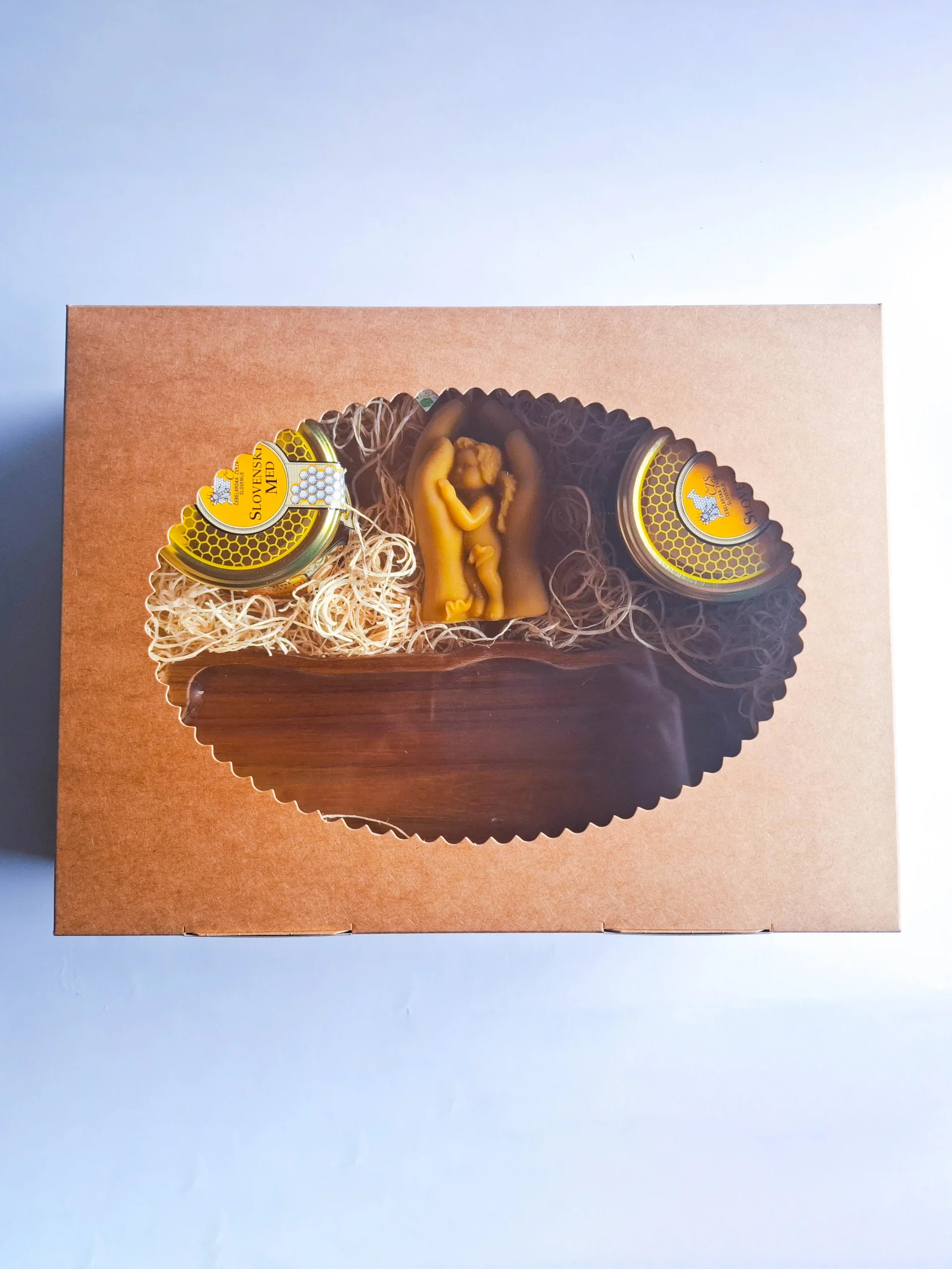 Paket Zaupanje vsebuje en kozarec 450g lipovega medu SMGO, en kozarec 450g kostanjevega medu SMGO, svečo angel v dlaneh ter lesen servirni pladenj.